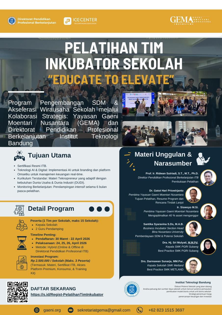 Program Pengembangan SDM & Wirausaha Sekolah melalui Kolaborasi Strategis: Yayasan Gaeni Moentari Nusantara (GEMA) dan Direktorat Pendidikan Profesional Berkelanjutan Institut Teknologi Bandung